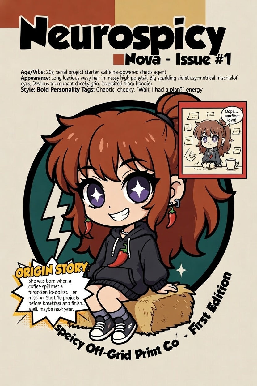 Neurospicy Off-Grid Print Co embraces the beauty of intentional craftsmanship, blending artistic vision with sustainable practices. Our mission is to create exceptional prints that spark joy and exploration, inviting you to experience the world in a vibrant new way.